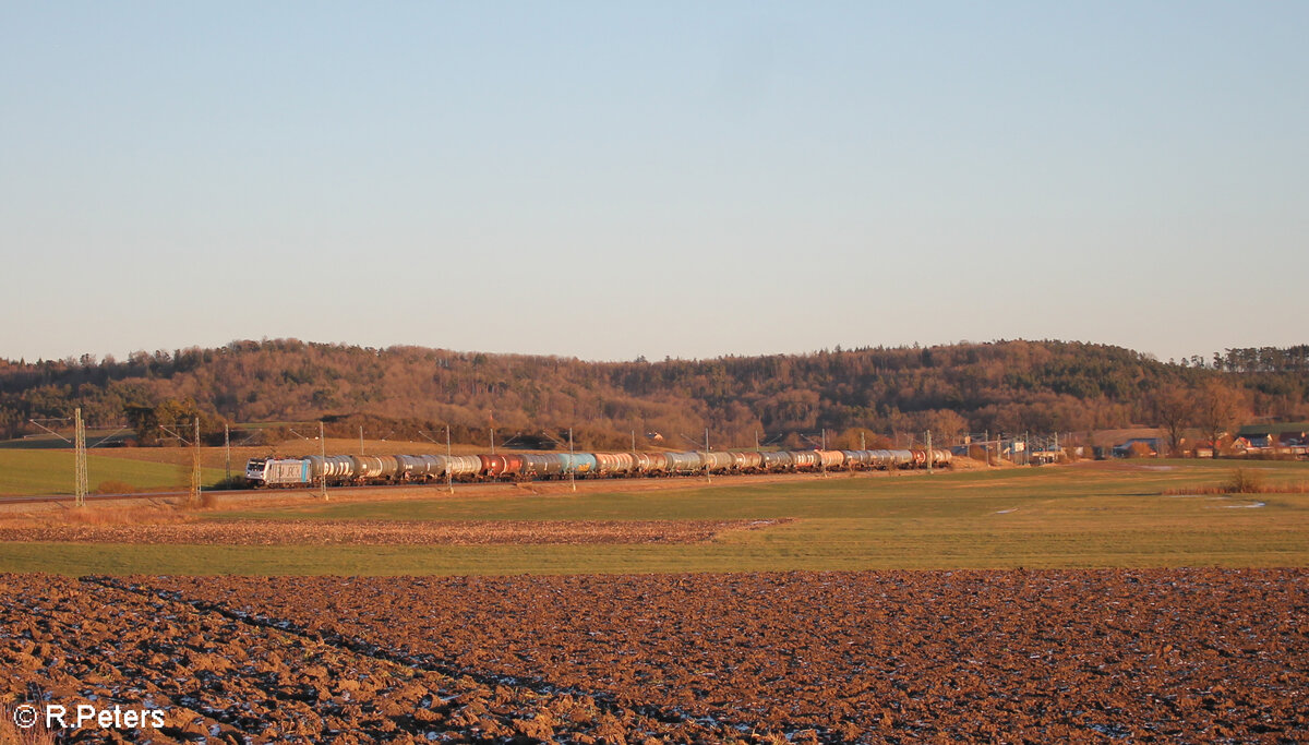 187 307-4 zieht ein Kesselzug bei Oberdachstetten während im Hintergrund schon der Neumond zu sehen ist. 12.01.25